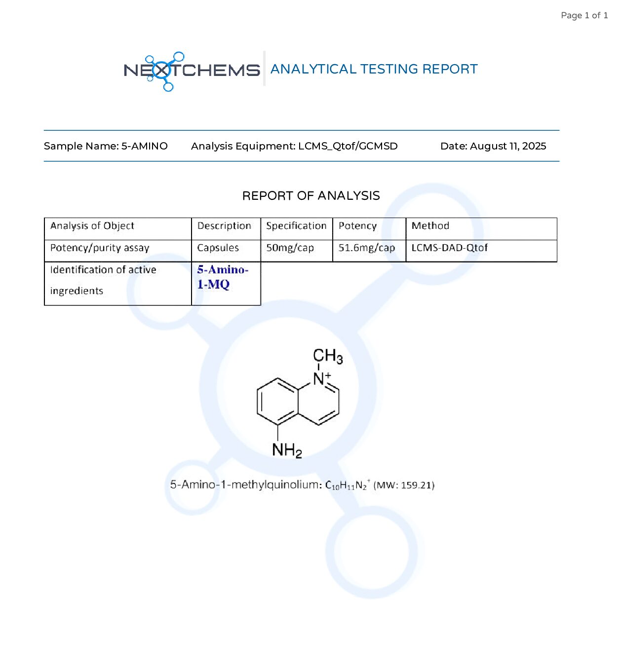 Non-toxic and absorbable, 5-Amino-1MQ has demonstrated therapeutic potential against body fat accumulation, diet-induced obesity, and type II diabetes, cancer, and cardiovascular diseases.